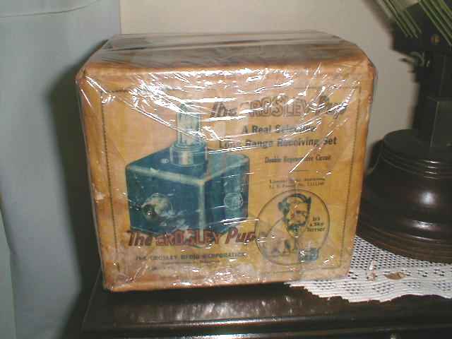 A working Crosley Pup with original box, two good tubes, a Cunningham C-299 with Frost tube adapter and a RCA Radiotron UV-199 in the original box and padding(lid missing). Some repair was done to the wires and one of the metal tags is missing which was replaced by a similar sized tag and marked A-. The grid leak was rebuilt with a modern resistor hidden in the original Montgomery Ward grid leak. The bottom label is mostly intact. A two inch square of one of lid flaps on the top of the original box is missing, but most of the labeling is intact on the sides of the box. The box is covered in plastic wrap for protection. More pictures available by email(see link below). $375 shipped CONUS.