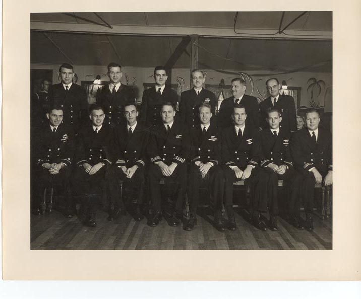 Officers and Chiefs, Shark II, February 1944 at Polly's Inn, Montville, CT. Francis S. Reilly, SMC is standing at extreme right of back row.