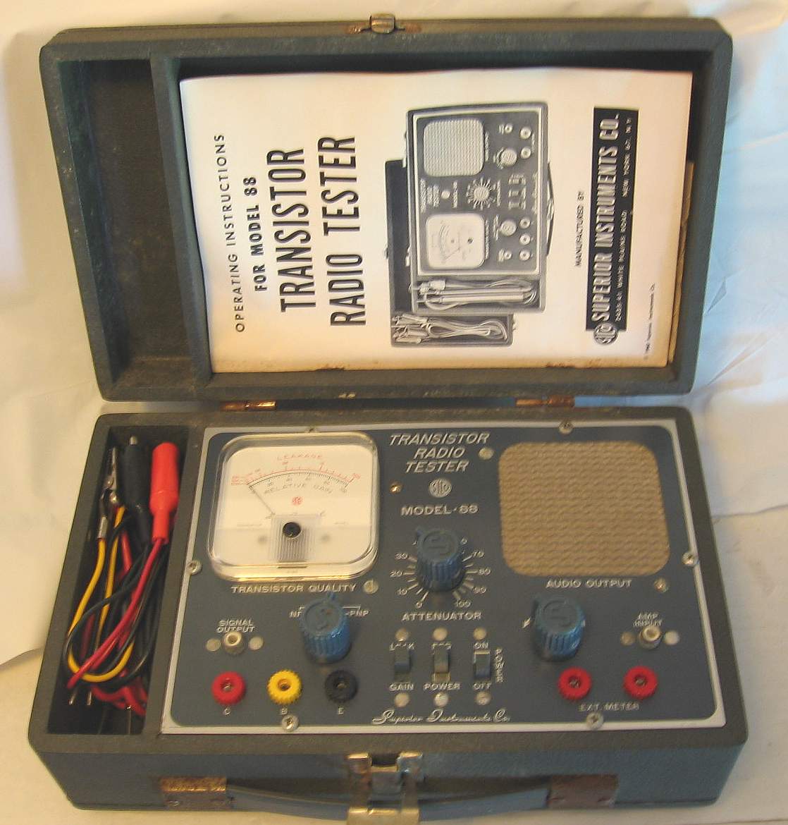 This is a nice, working transistor radio tester that tests transistors for leakage and gain. It functions as a audio modulated signal source that covers all audio I.F. and R.F. frequencies normally found in a transistor radio. It also has a signal tracer for I.F., R.F. and audio work. It is original except for new batteries which are included. It is complete with leads, manual and original sales receipt from March 1962. $55 plus shipping.